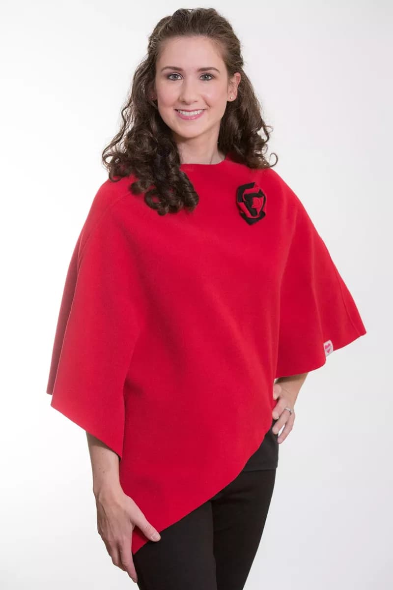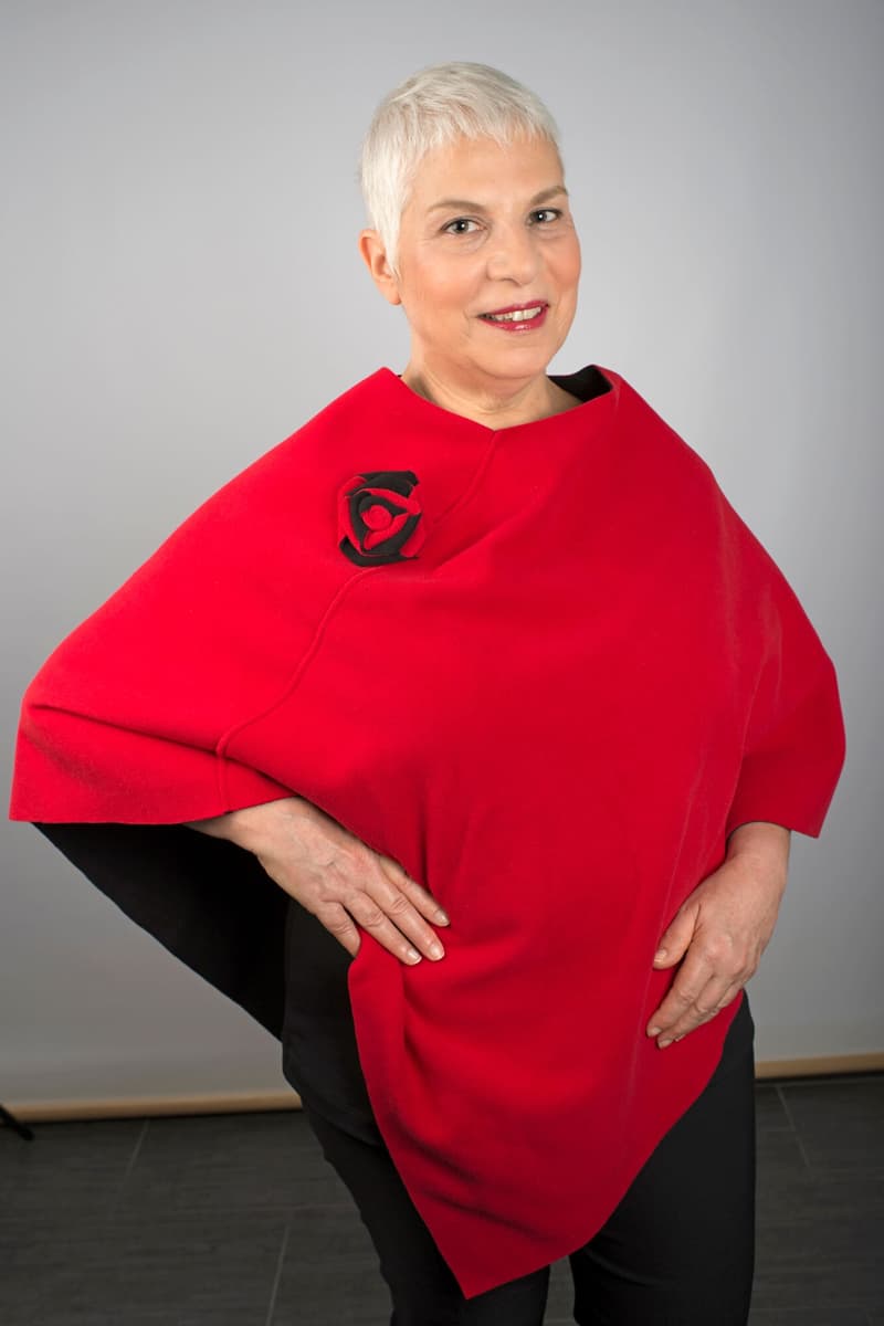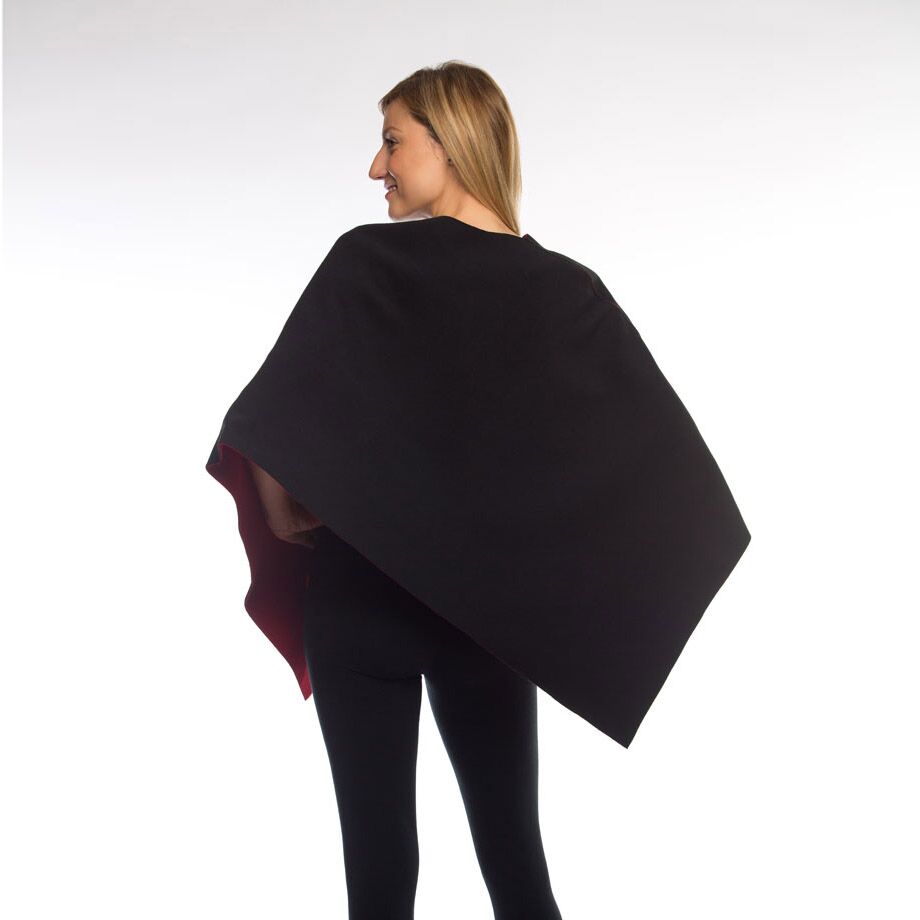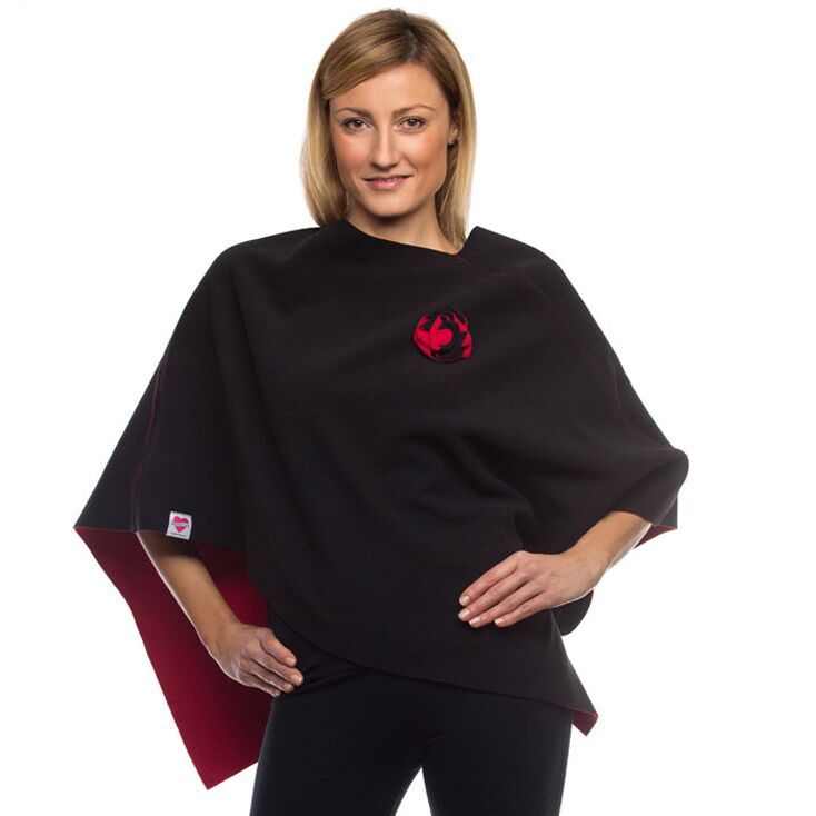 We agree with the fashionistas — ponchos are universally flattering and a quick style fix. This reversible chemotherapy poncho is red on one side when you are feeling sassy and black on the other when you’re opting for classy—topped off with a detachable rosette pin. An ideal cover-up from hospital to home, during treatment and after.